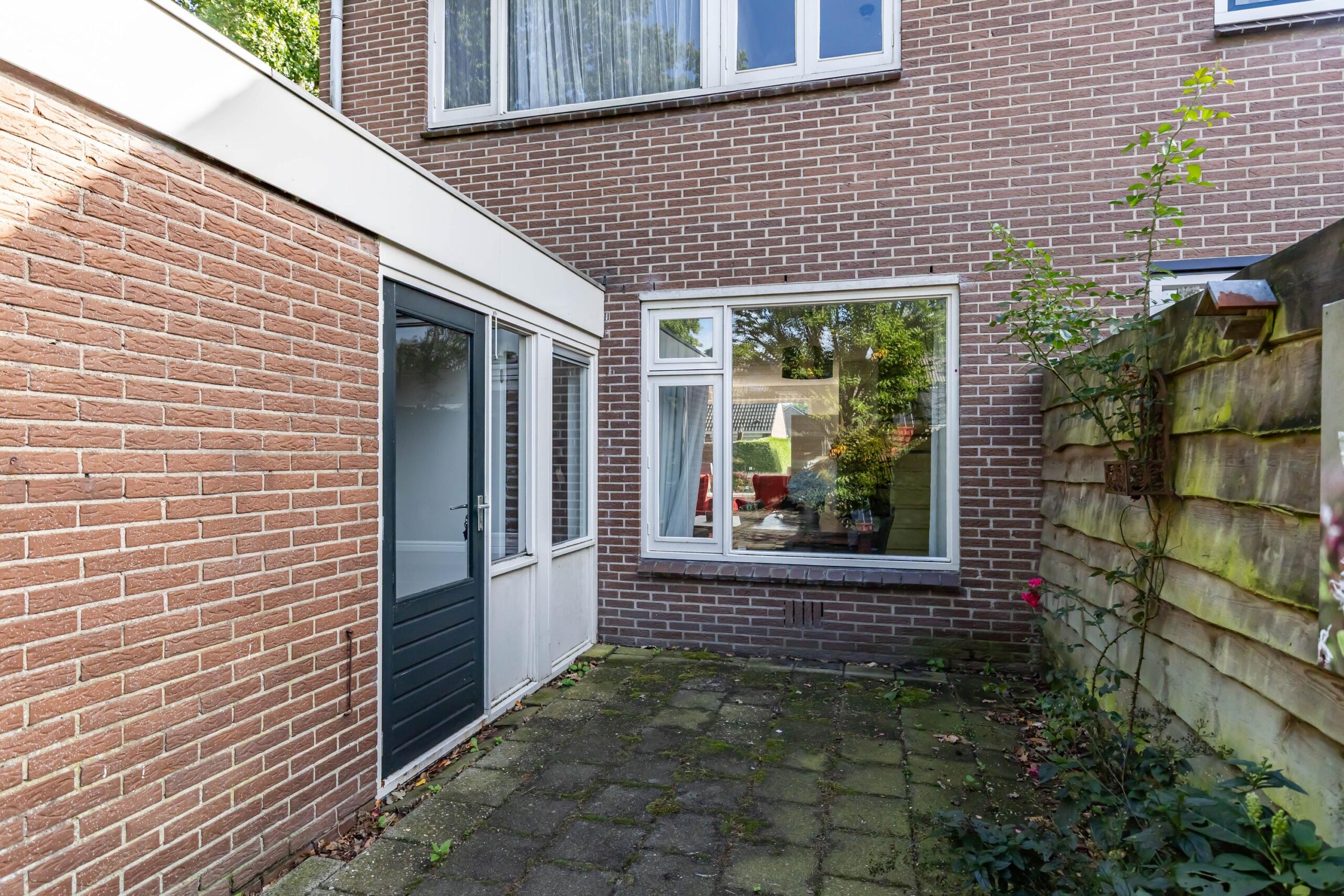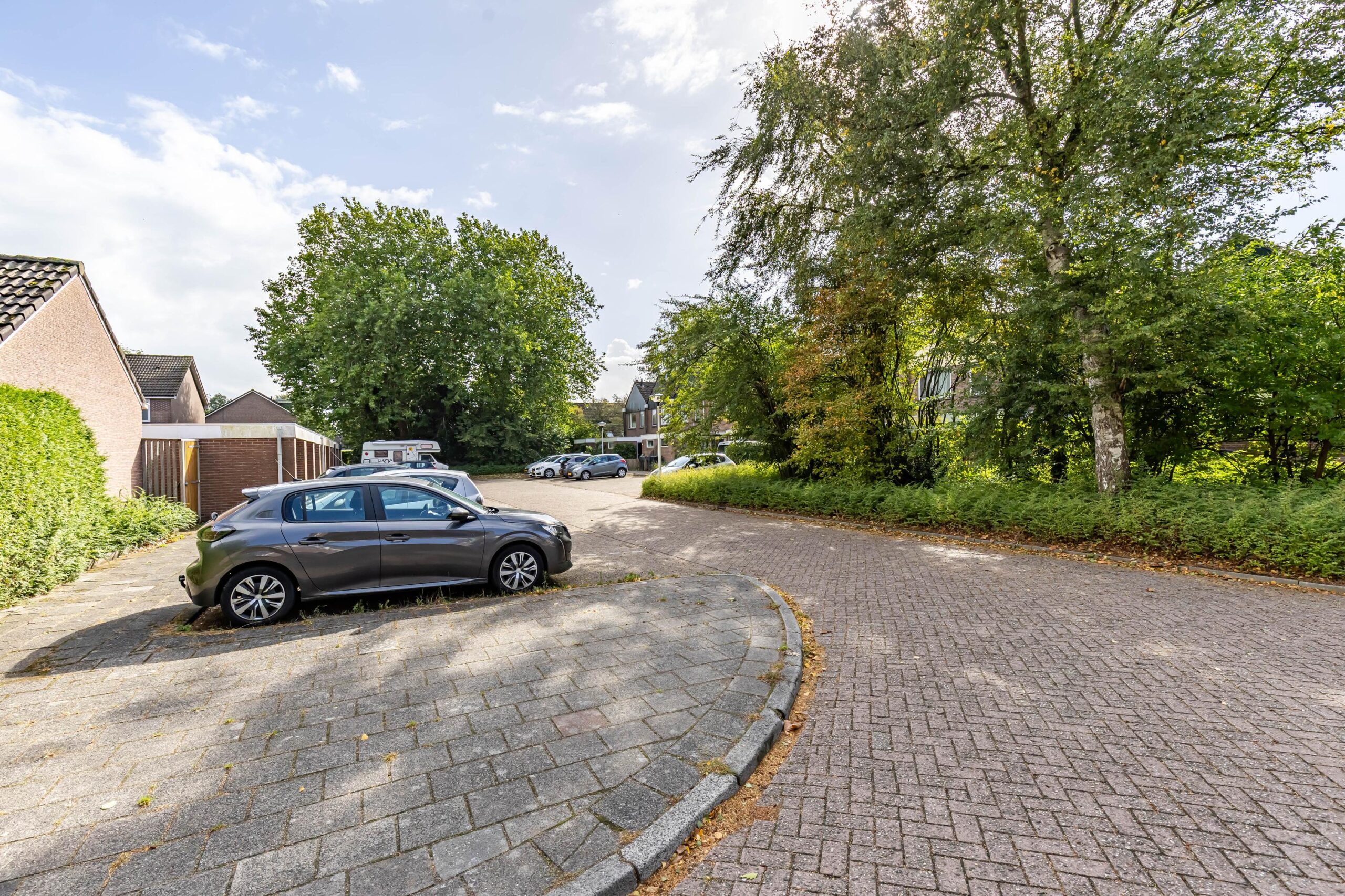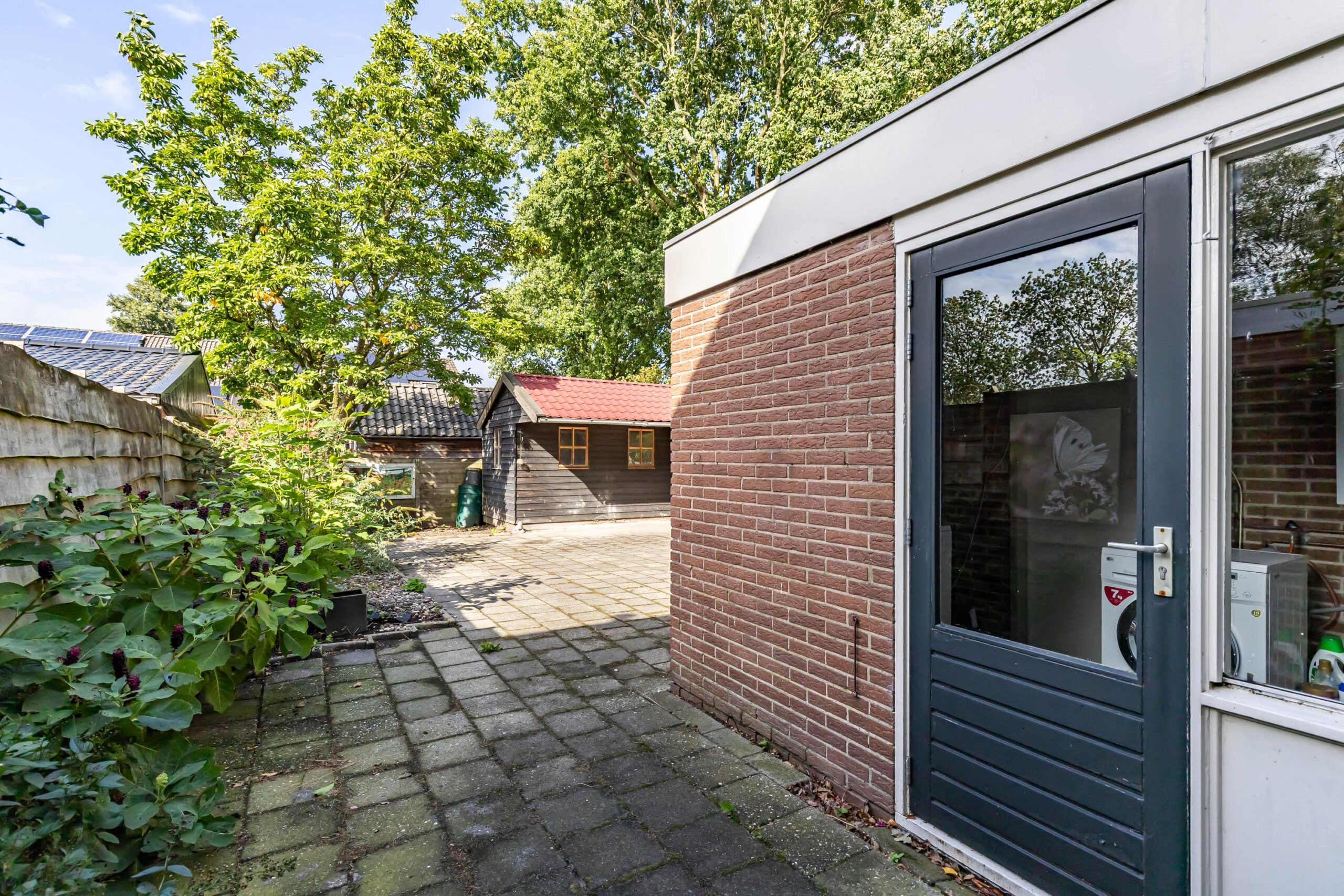 De tuin rondom de woning bestaat veelal uit bestrating. Daarnaast bevindt zich ook nog vrijstaande houten schuur in de tuin. De oprit biedt ruimte voor meerdere auto’s.