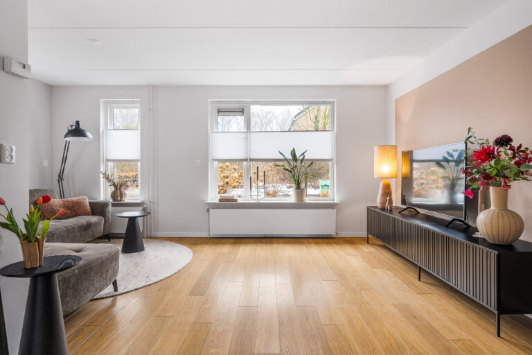 De woonkamer heeft een rustige, eigentijdse uitstraling dankzij de strakke afwerking en warme vloer. Een fijne basis waar je eenvoudig jouw eigen sfeer aan toevoegt.