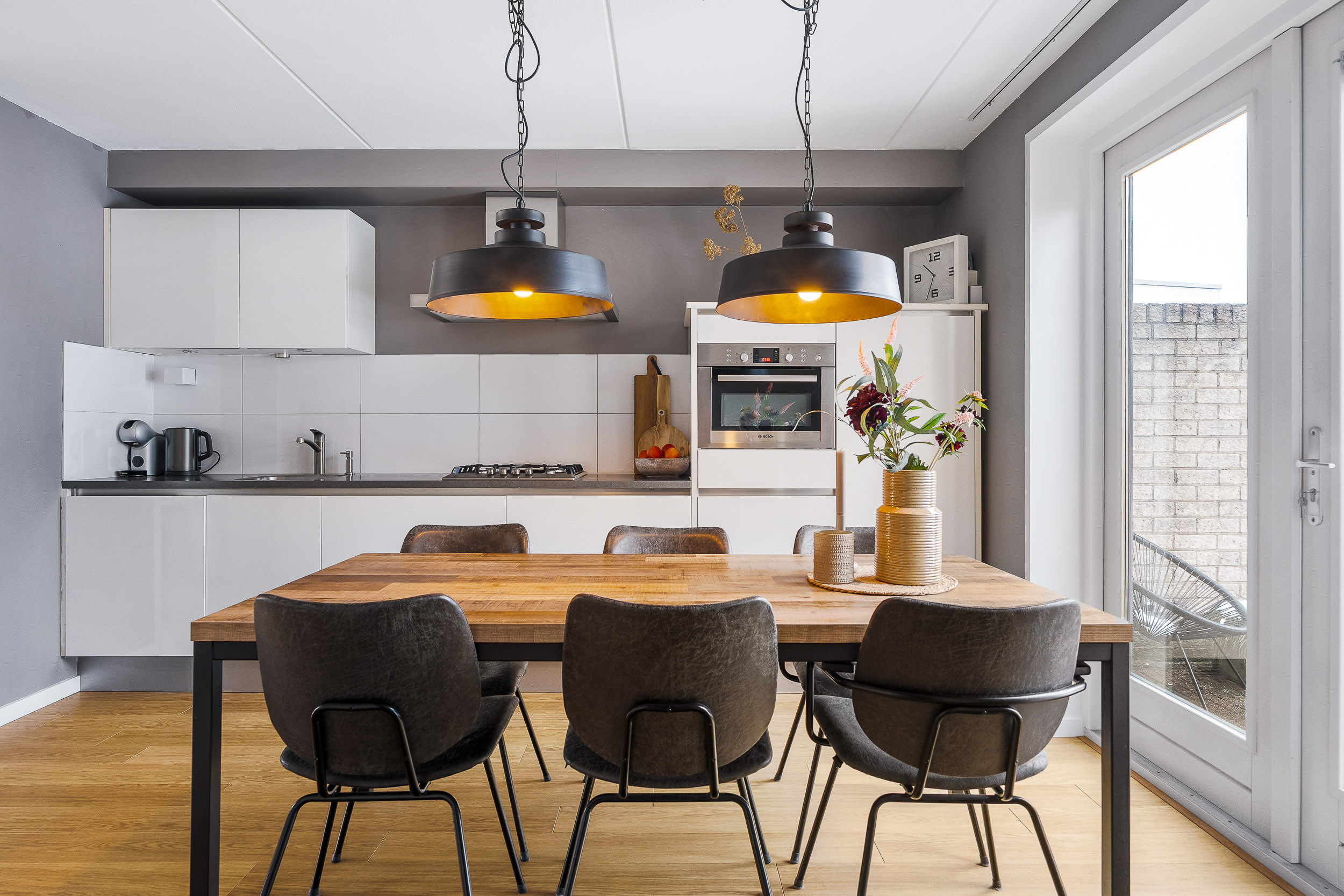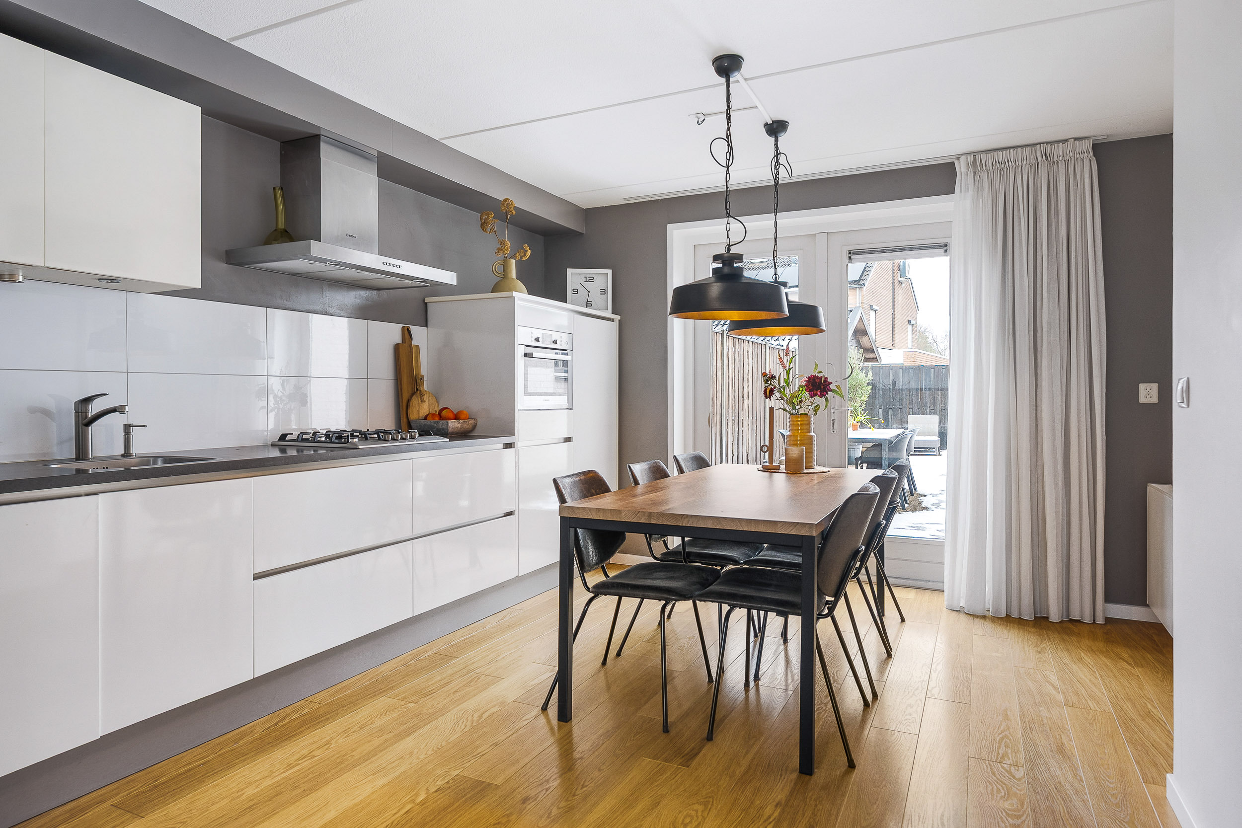 Aan de achterzijde ligt de open keuken met eethoek. Modern uitgevoerd en compleet ingericht – een plek waar koken en samen zijn moeiteloos samenkomen. Via de tuindeuren loop je zo de tuin in. In de zomer zet je alles lekker open en betrek je buiten bij binnen, terwijl je in de winter geniet van lange, gezellige avonden aan tafel.