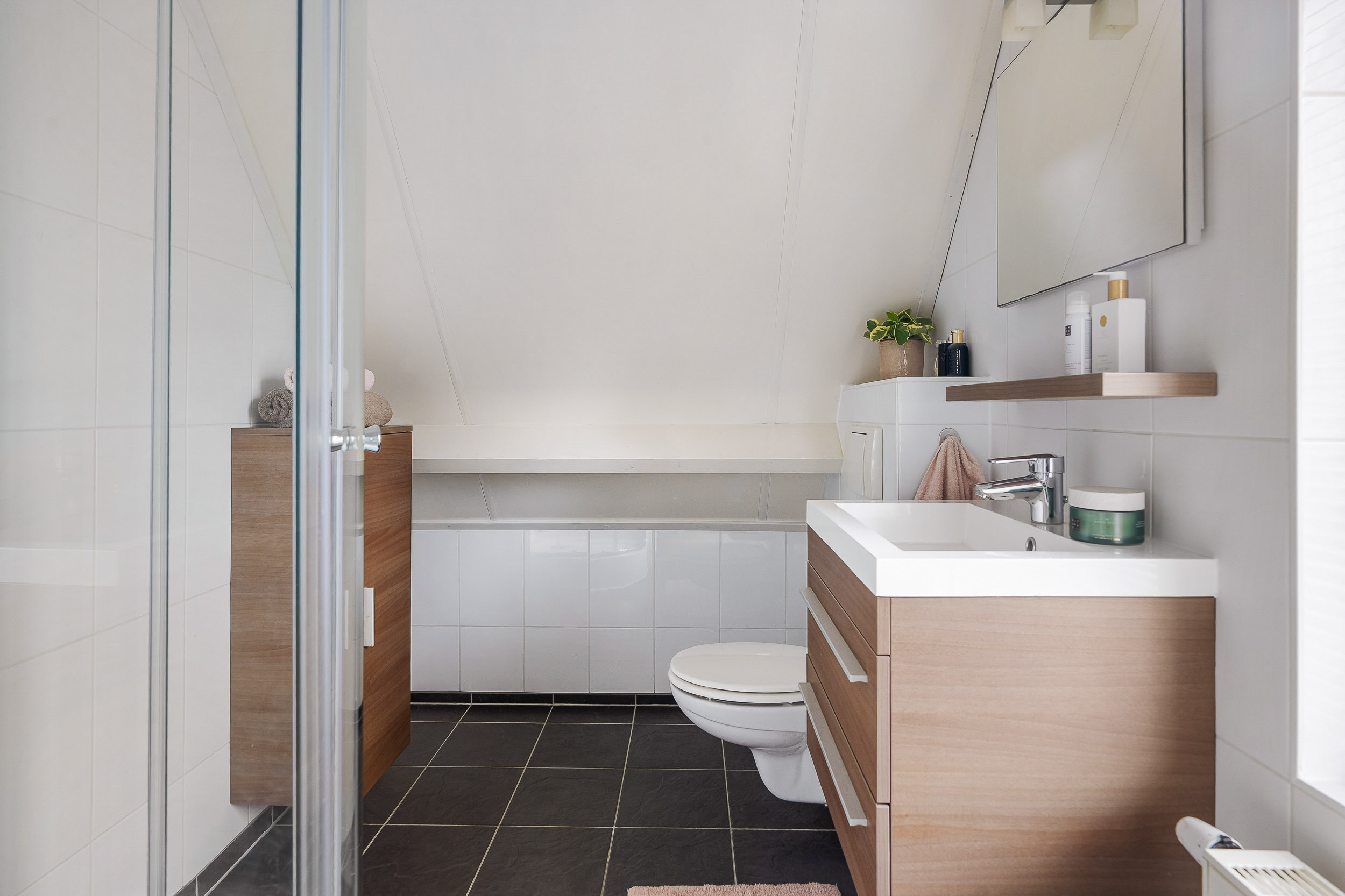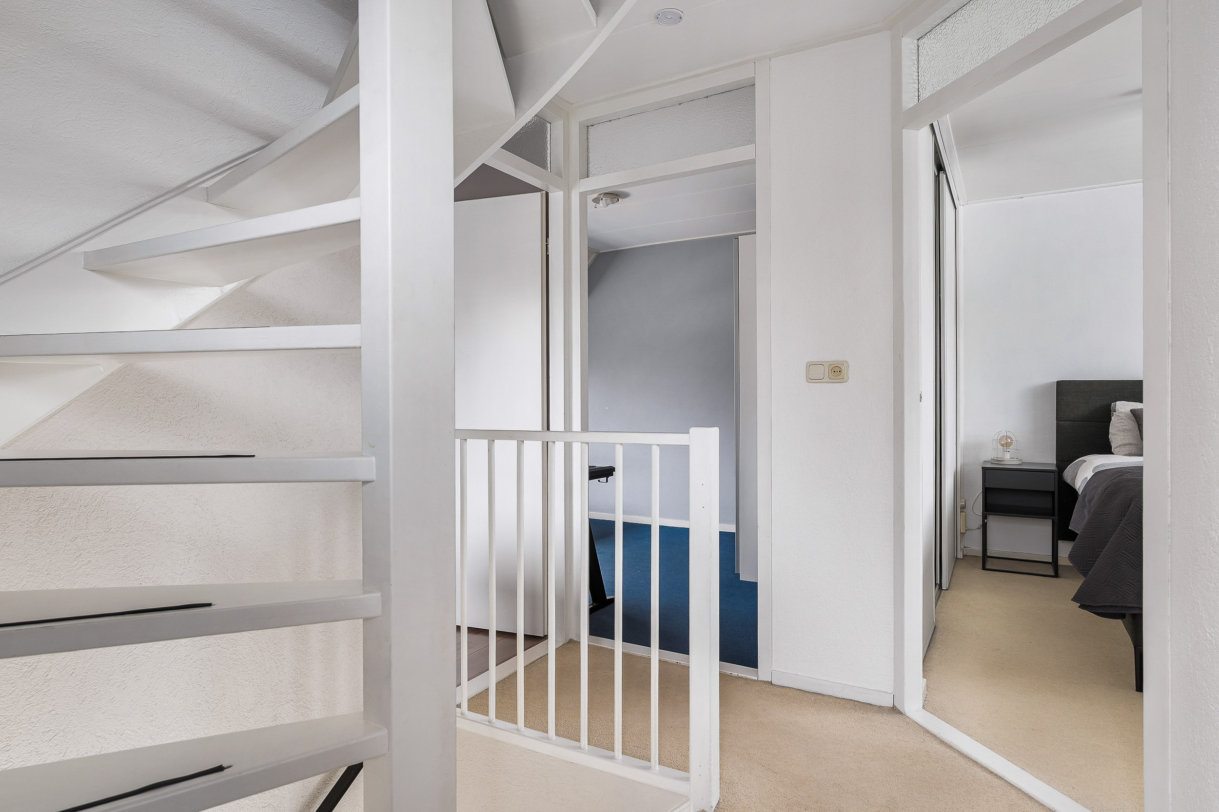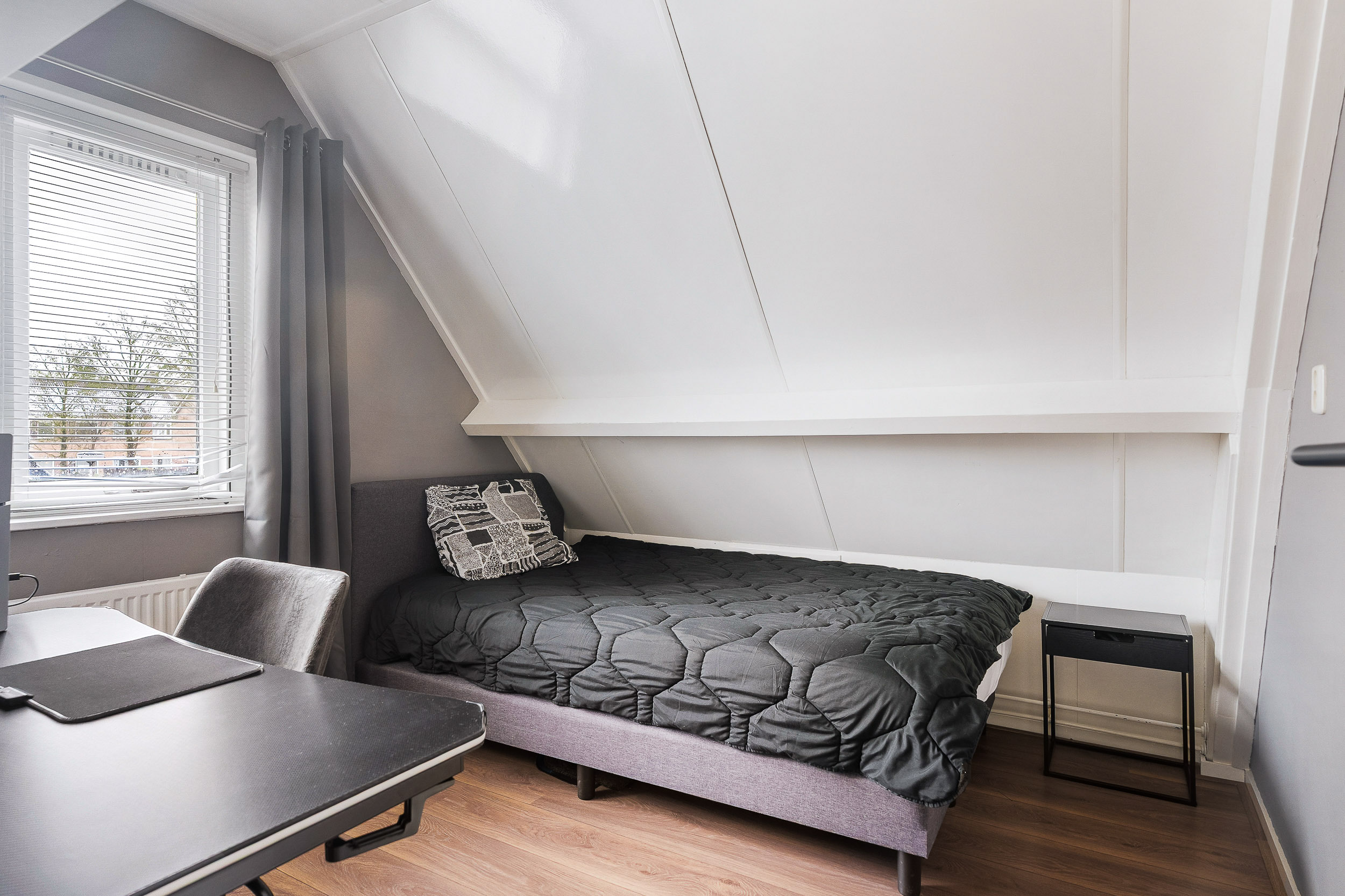 Op de eerste verdieping vind je meerdere slaapkamers van goed formaat. Ideaal voor een gezin, een thuiswerkplek of een hobbykamer. De badkamer is modern en compleet ingericht met een inloopdouche, wastafelmeubel en toilet. Alles is netjes afgewerkt, waardoor je hier zonder grote aanpassingen kunt starten.