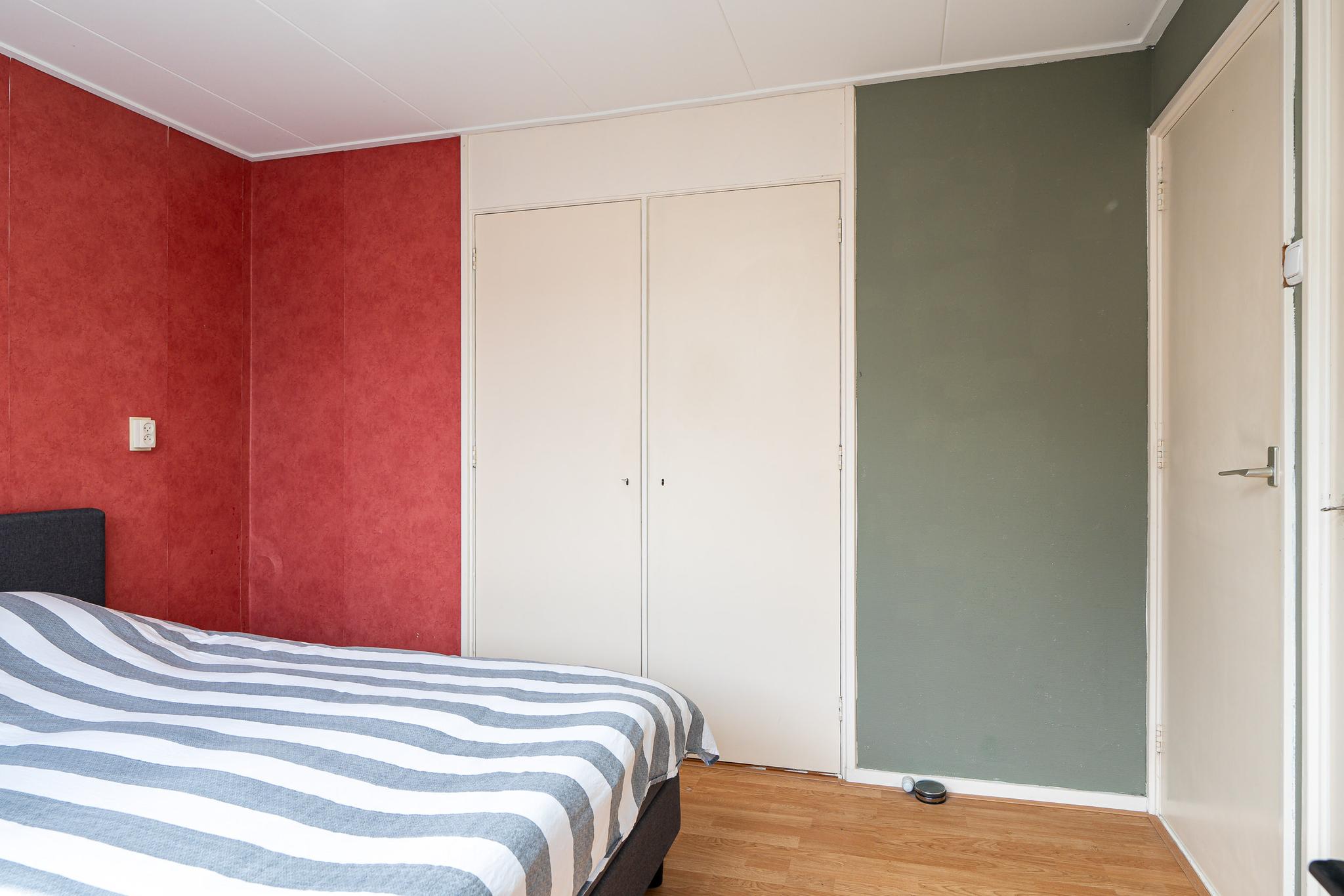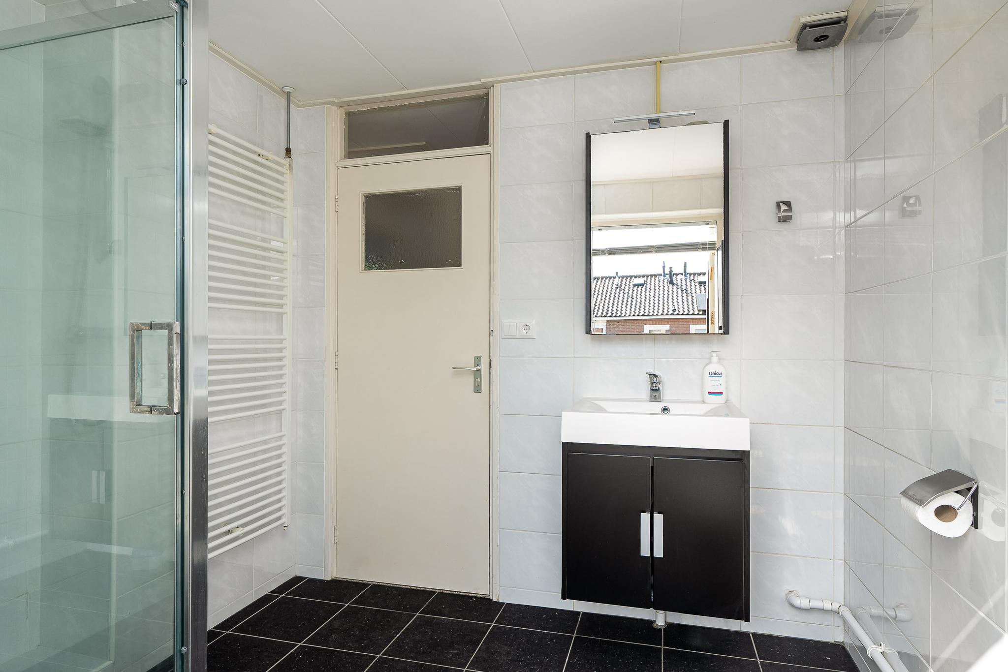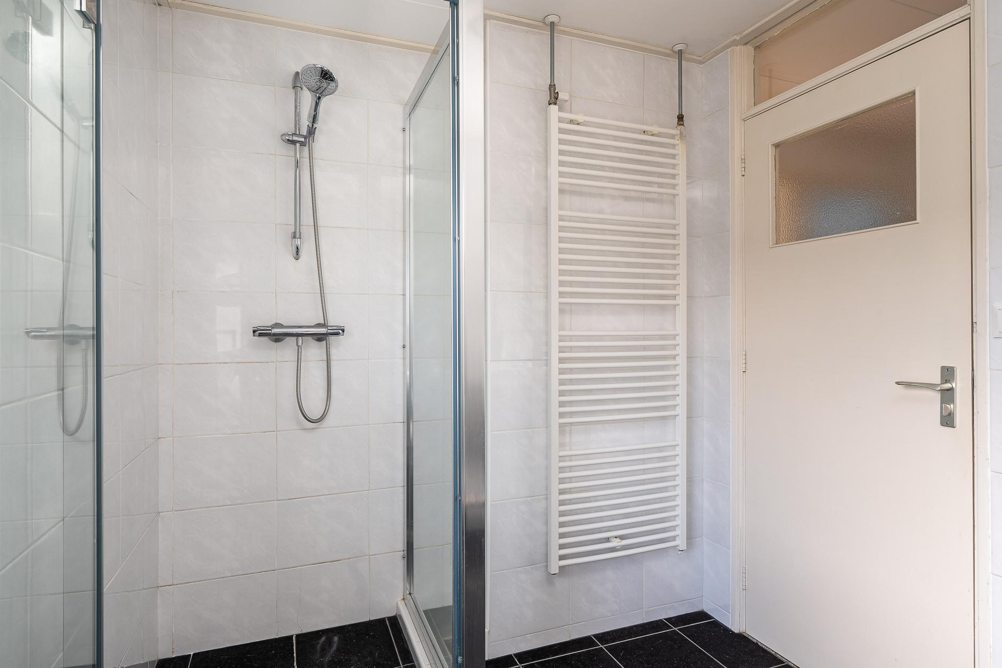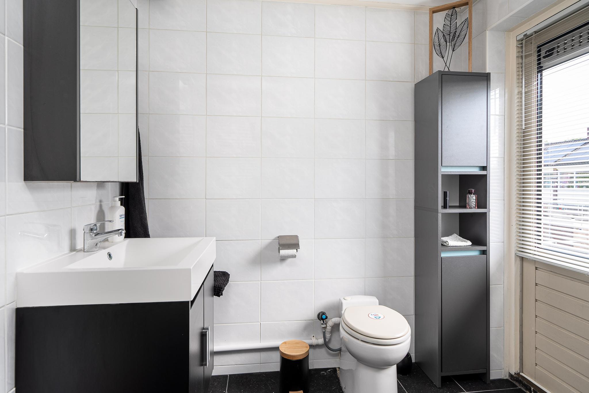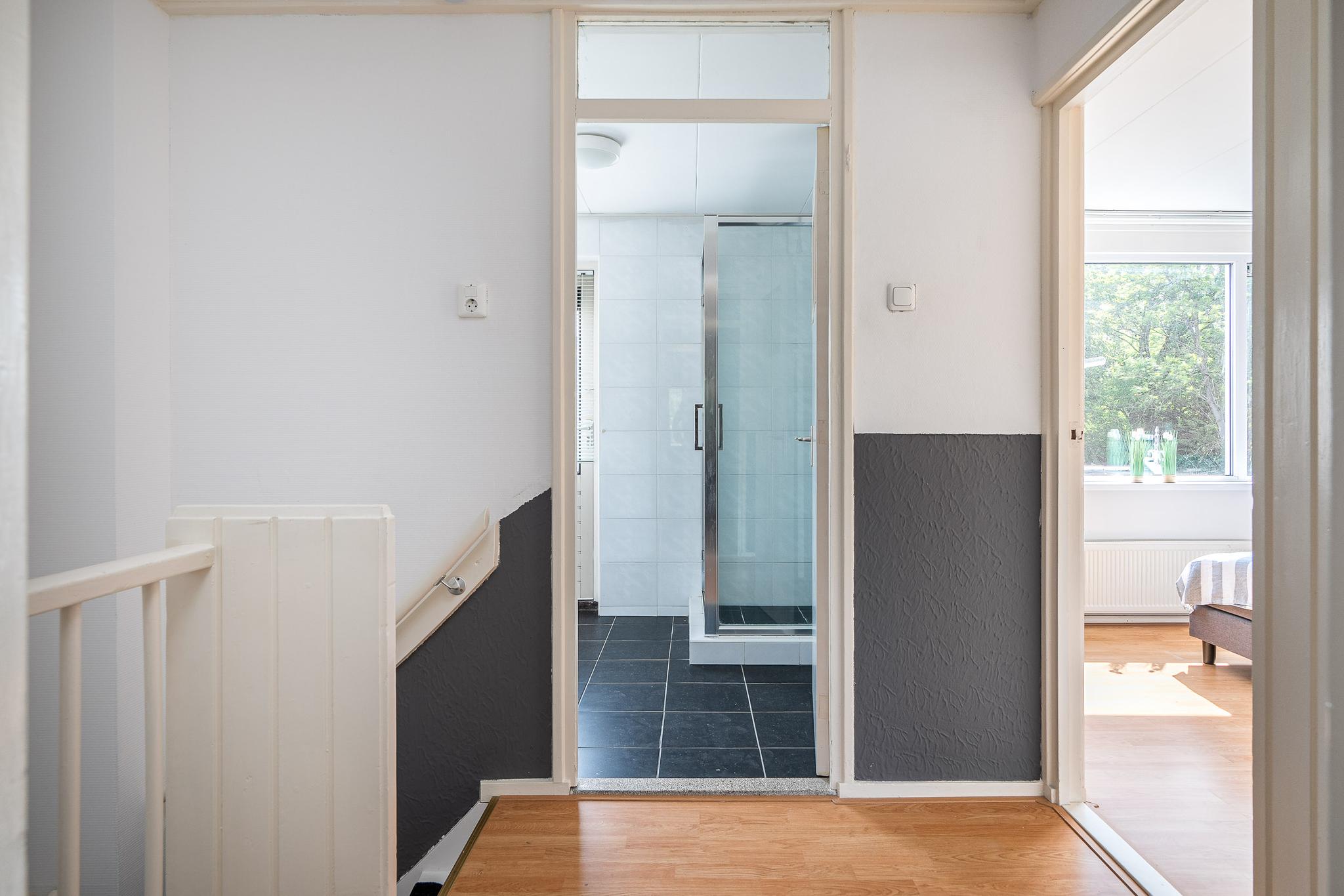 1e verdieping: Overloop, 3 slaapkamers met vaste kasten, badkamer met wastafel, douchehoek, en toilet.