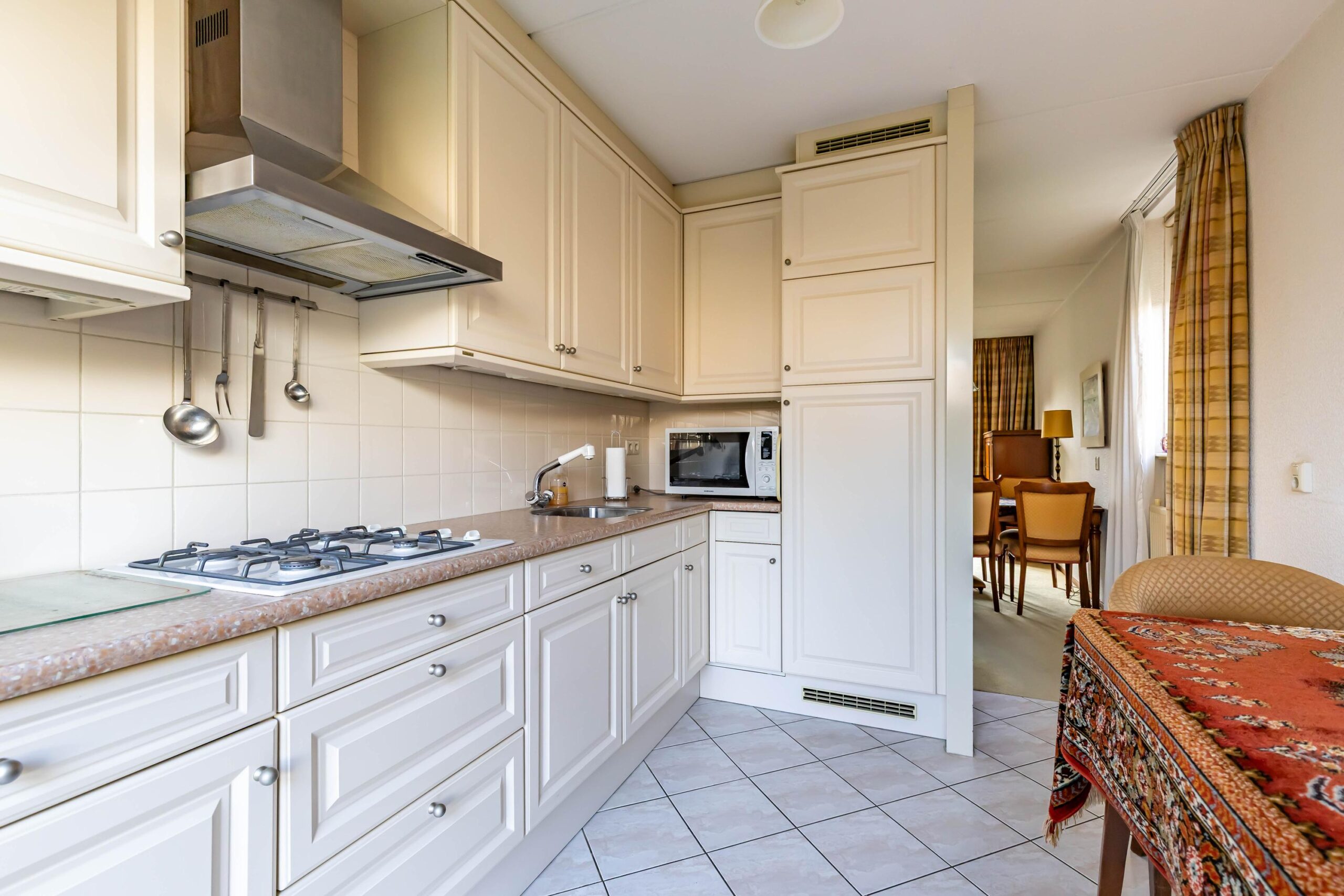 De halfopen keuken staat in verbinding met de woonkamer en is voorzien van diverse inbouwapparatuur.