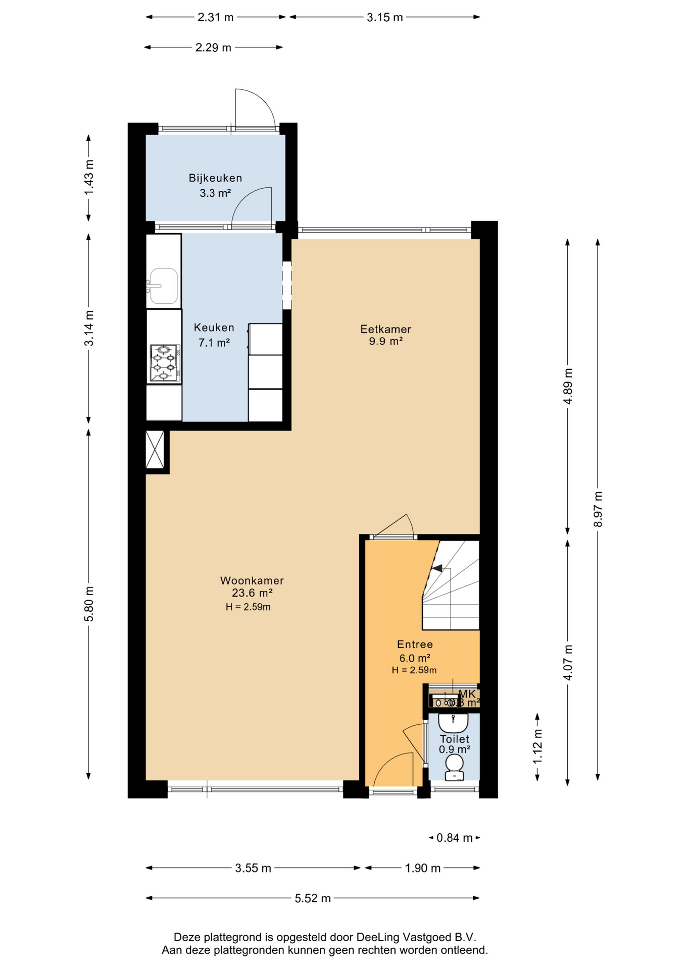 Deze informatie is door ons met de nodige zorgvuldigheid samengesteld, veelal aan de hand van de door verkoper aan ons ter hand gestelde gegevens en tekeningen. Onzerzijds wordt echter geen enkele aansprakelijkheid aanvaard voor enige onvolledigheid, onjuistheid of anderszins, dan wel de gevolgen daarvan. Dit geldt voor onder meer de opgegeven maten, oppervlakten, isolatie en ouderdom van technische installaties.