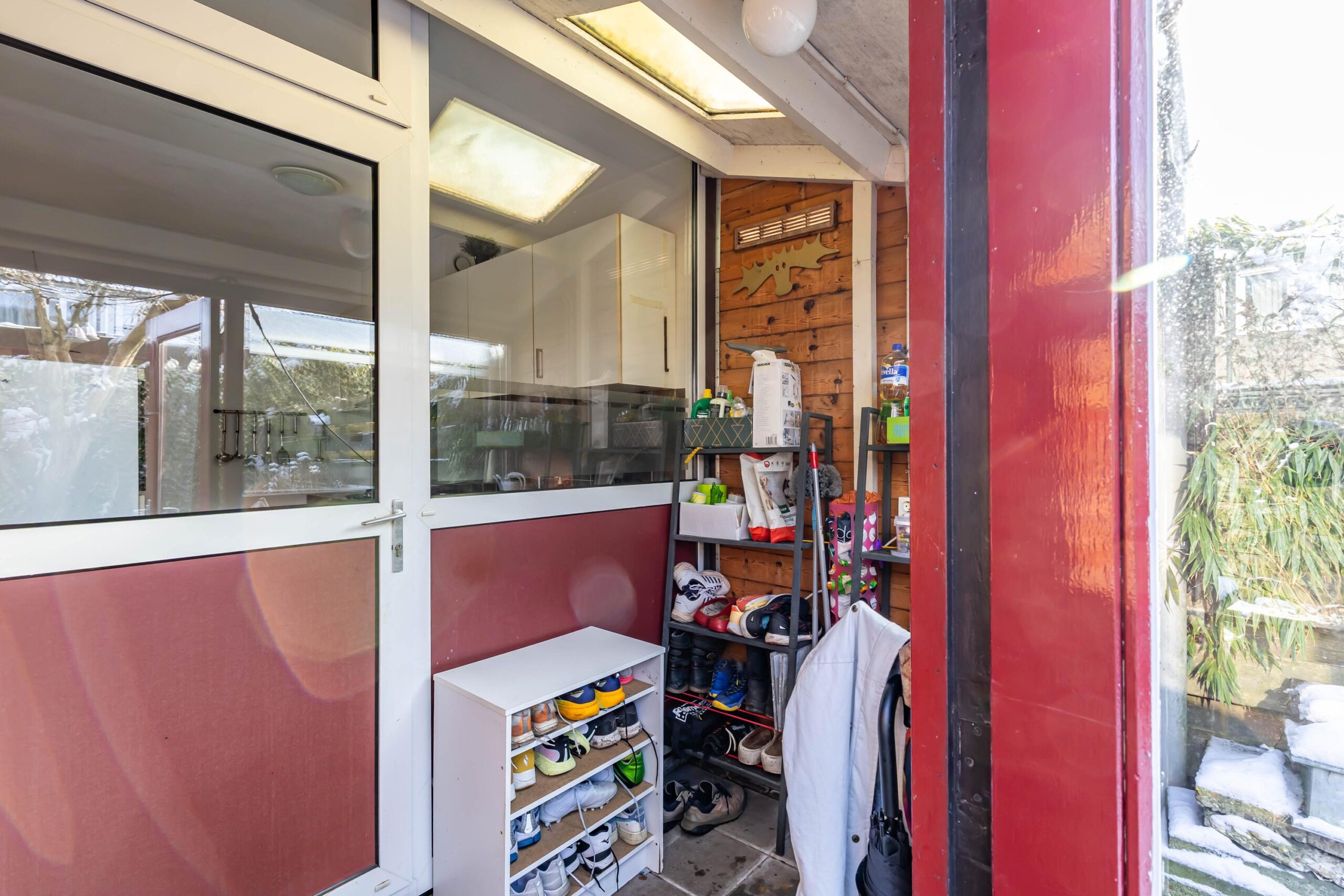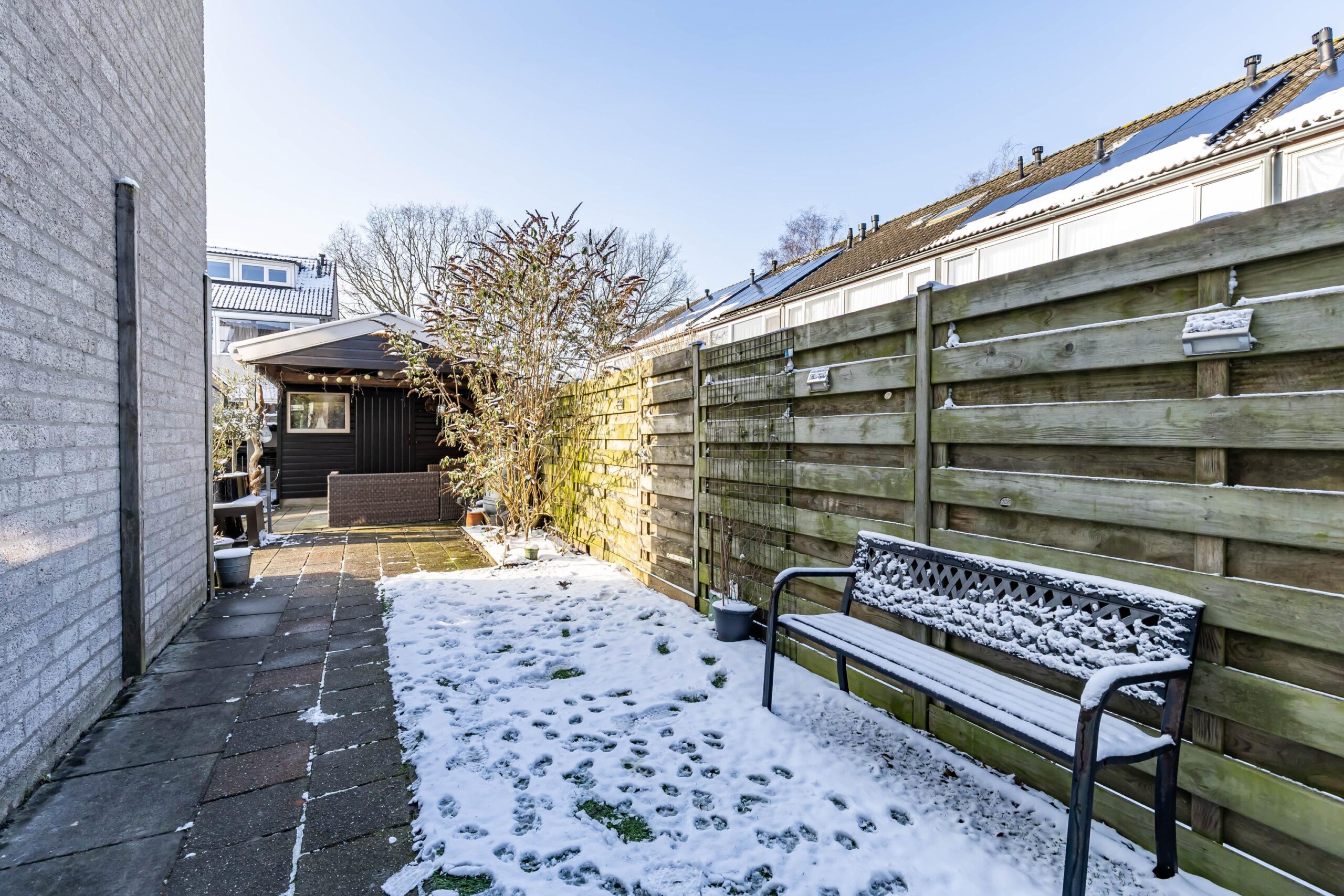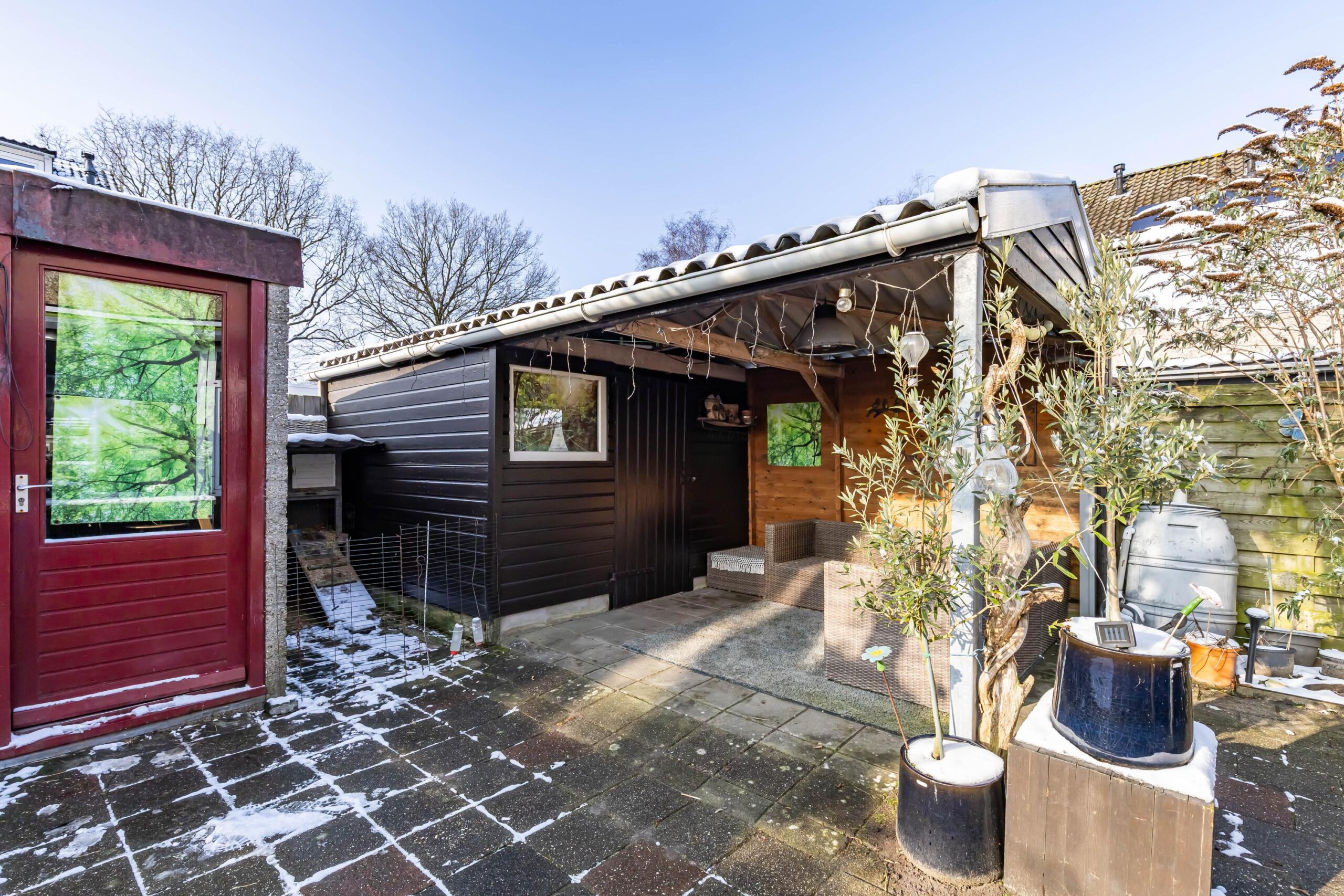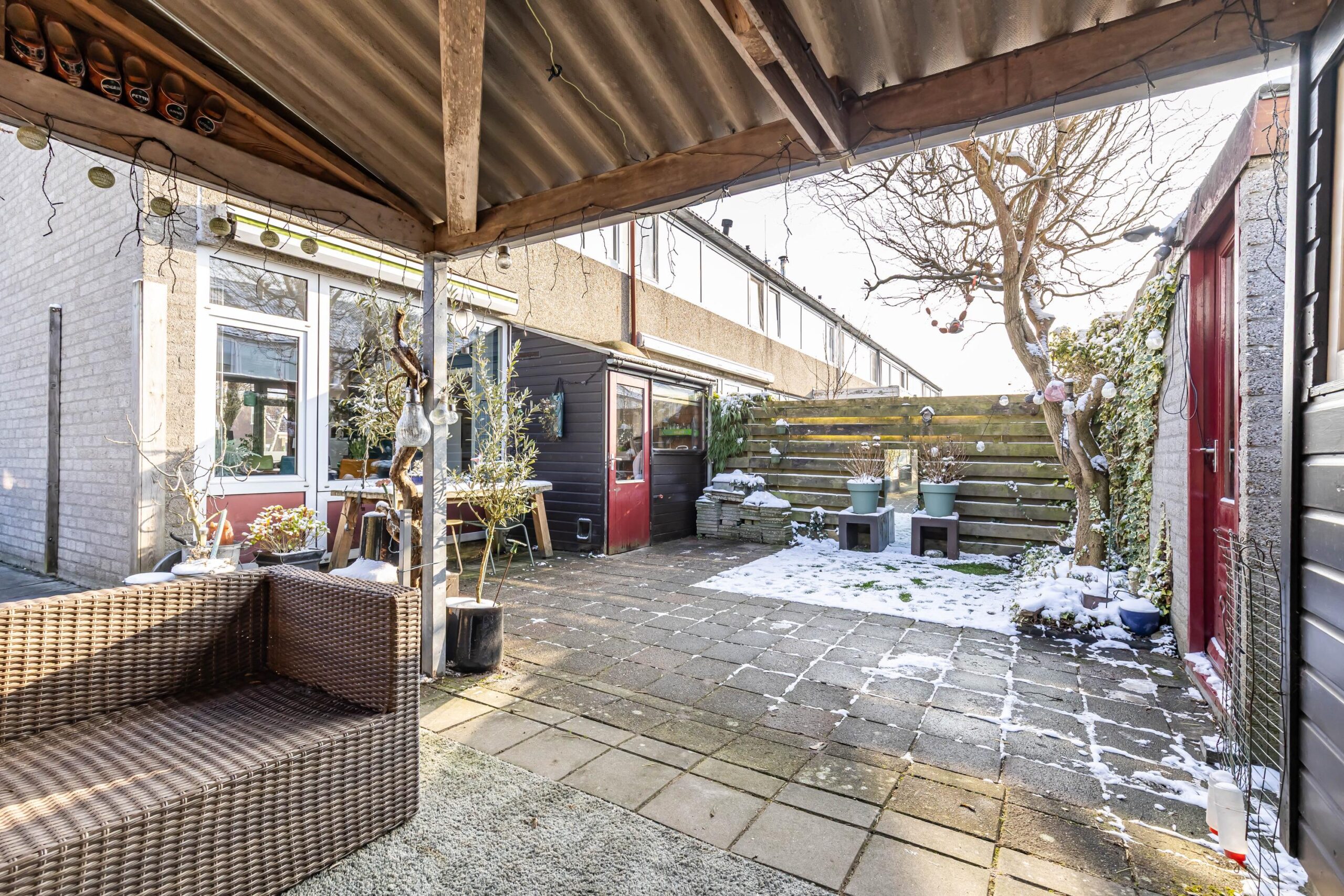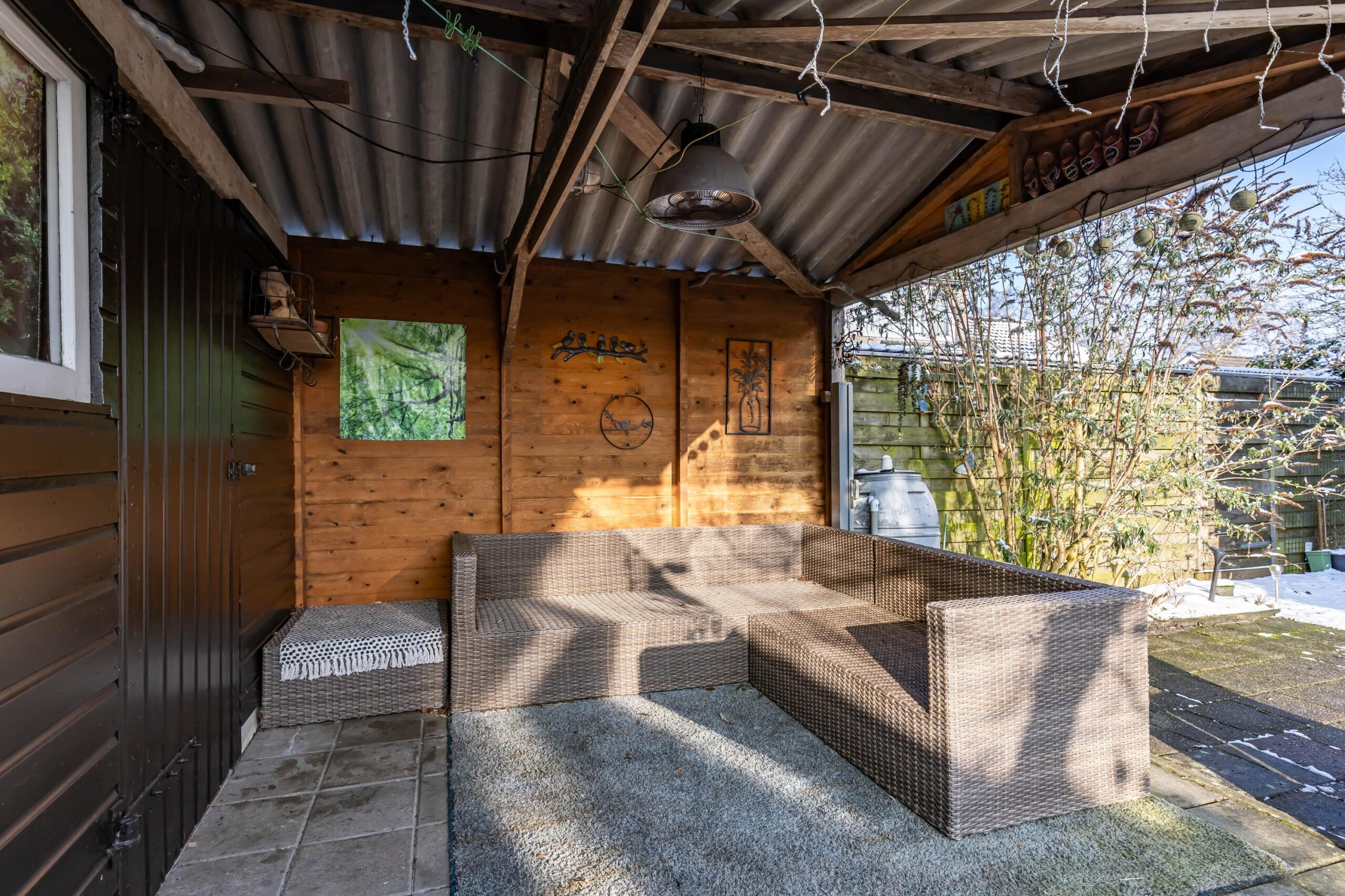 In de achtertuin vind je een houten garage welke momenteel is omgebouwd als extra berging en een overkapt terras. Daarnaast is er een aparte stenen berging, perfect voor fietsen, tuinspullen en gereedschap.